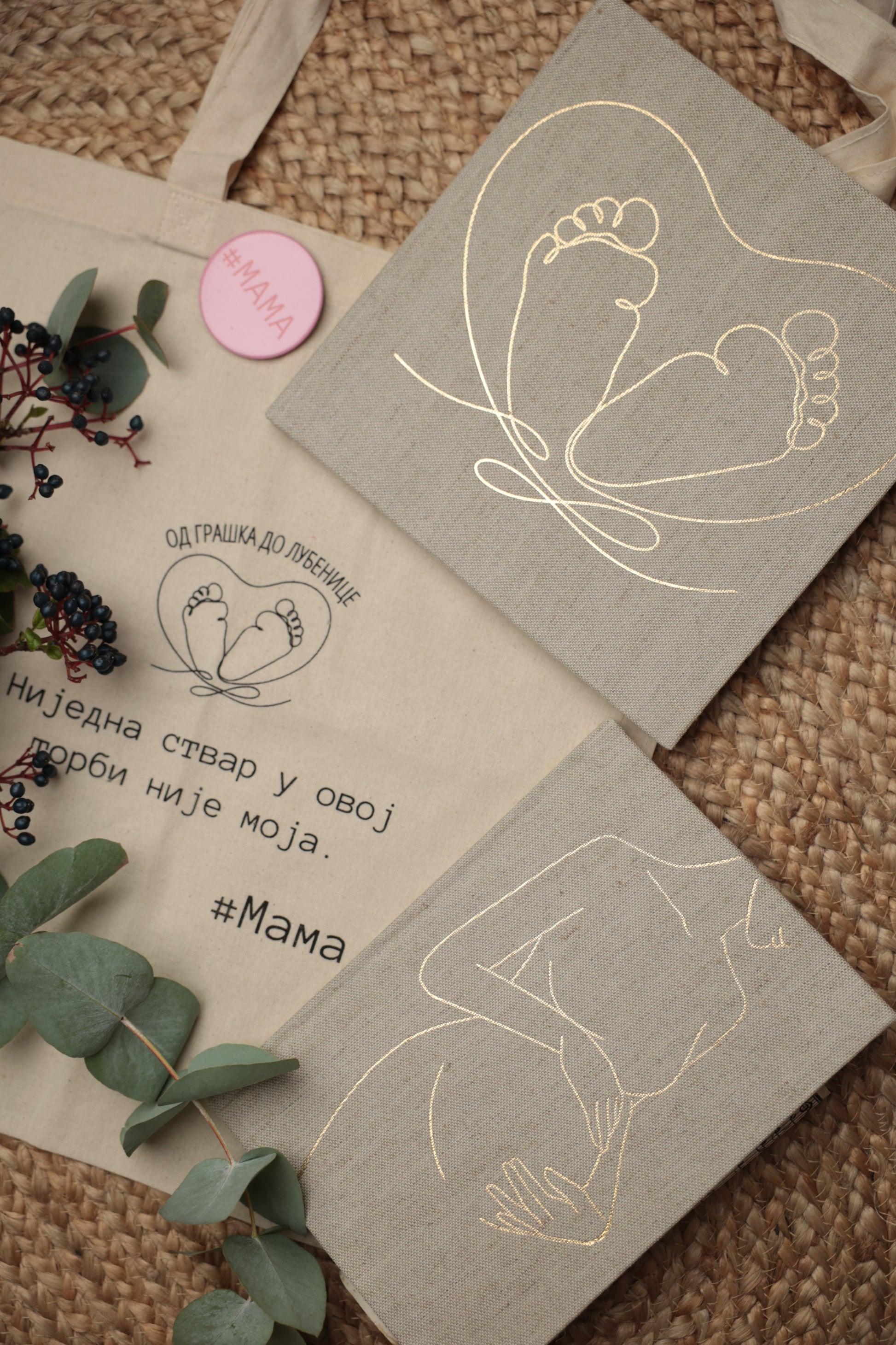Takođe, uz kupovinu kompleta dobijate na poklon predivan ceger sa natpisom "Nijedna stvar u ovoj torbi nije moja" i bedž "#mama".